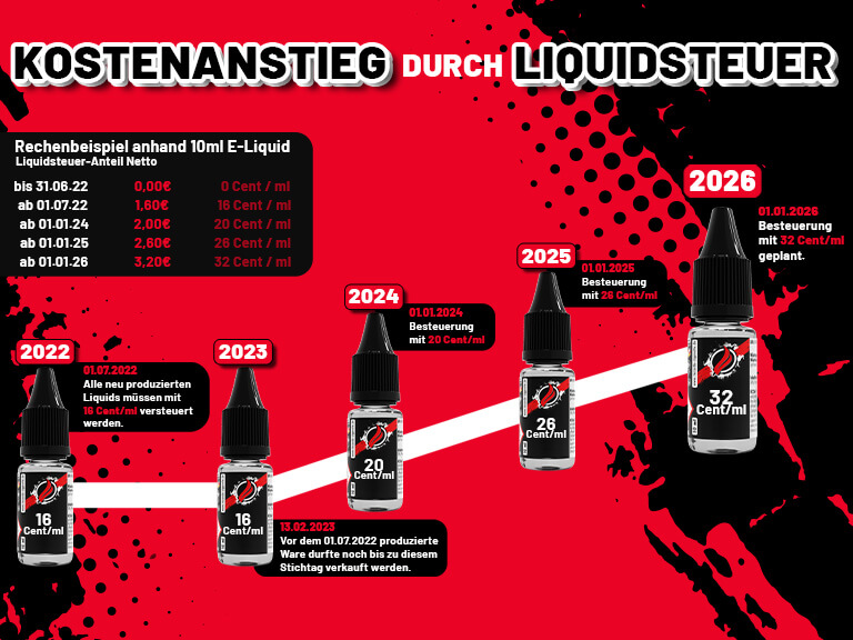 Die Liquidsteuer 2026 bringt eine Erhöhung von bisher 0,26 € auf 0,32 € pro ml mit sich. Diese Anpassung führt auch zu einem höheren Mehrwertsteueranteil, da die Mehrwertsteuer auf den Gesamtpreis inklusive der Liquidsteuer berechnet wird. Zusätzlich wirken sich steigende Rohstoff- und Produktionskosten auf die Preisgestaltung aus. All diese Faktoren führen dazu, dass der Verkaufspreis von E-Liquids im kommenden Jahr voraussichtlich steigen wird.